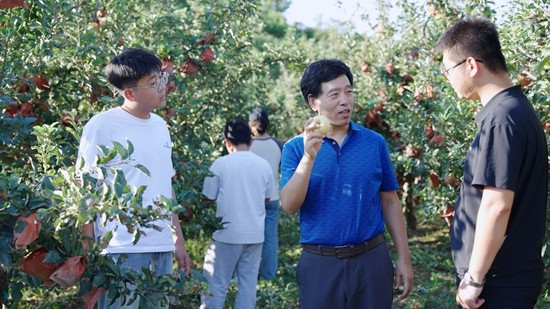 司炳成(右二)与学生们在栖霞苹果实验站讨论果园缺水问题。受访者供图