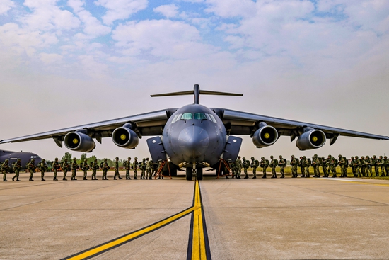 空降兵某部官兵登上运-20飞机进行跳伞训练。空降兵某部供图