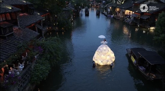 在某几个时间点,你要早点赶到河边、桥上。去晚了,你可能会错过水上歌剧《漂浮歌后》的最佳观赏角度。“歌后”以水为舞台,以伞为裙摆,咏叹调响彻河道两岸。