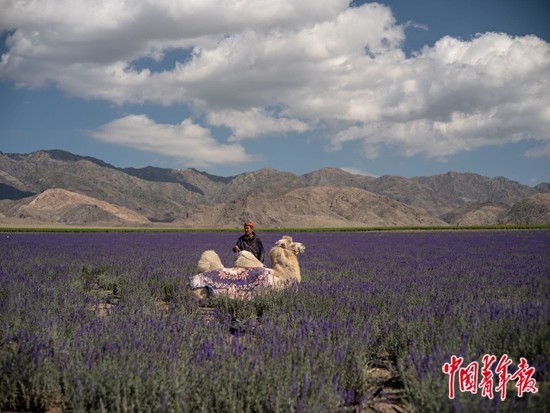 9月28日,新疆维吾尔自治区伊犁哈萨克自治州伊宁县喀什镇,为观光游客准备的骆驼卧在薰衣草花海中。中青报·中青网记者 李隽辉/摄