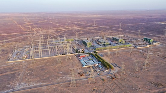 天山换流站位于哈密市伊州区,是±800千伏哈密南—郑州特高压直流输电工程的起点。图为航拍戈壁中的天山换流站。郭健/摄