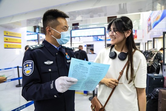8月27日,在吉木乃口岸入境大厅,外籍入境旅客正在工作人员的帮助下有序填写入境卡信息。中青报·中青网记者 贾骥业/摄