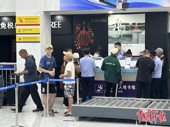 繁忙是新疆维吾尔自治区阿勒泰地区吉木乃县境内口岸的常态。8月底,中青报·中青网记者在这里看到,一辆辆大货车排队通关,从这里走出国门;口岸的出入境大厅人群熙攘,验证台前排起“长龙”。“欢迎回国!”吉木乃出入境边防检查站执勤六队四级警长齐文君热情地同旅客打着招呼。
