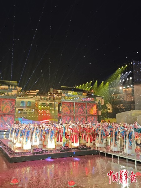 2024年8月26日晚,来自西安、喀什的128名各民族演员冒雨演出《心动喀什》。中青报·中青网见习记者 席聪聪/摄