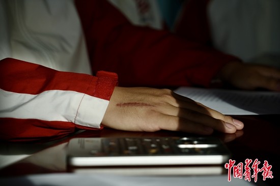 10月23日,新疆阿拉尔,00后志愿者舒宏振在课堂上骨折的右手仍旧留着伤疤。中青报·中青网记者 李强/摄