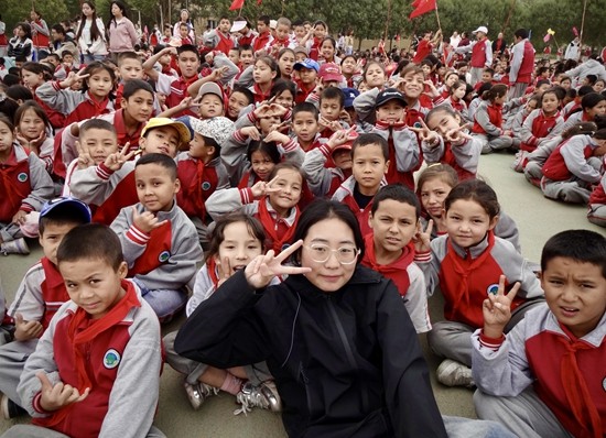 9月28日,新疆昆玉,皮山农场中学运动会上,邱琼瑶与学生合影。罗雪玲/摄