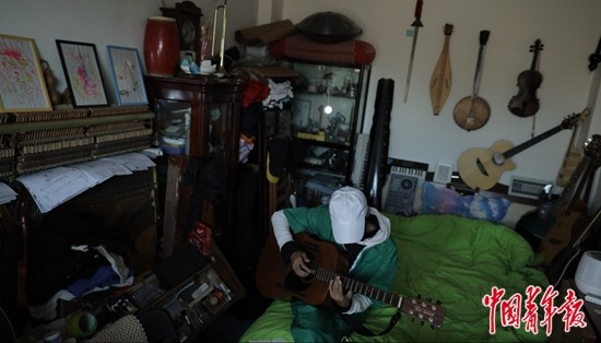 去年,他驻唱的酒吧倒闭,他搬到了大兴的村子里,月租200元。在这间15平方米的房间里,9把吉他、10多把笛子、小提琴、大提琴、古琴和若干不知名的乐器守在他床边。小号旁边搁着打碎的碗和停走的钟,架子鼓上挂着毛巾和衣架。