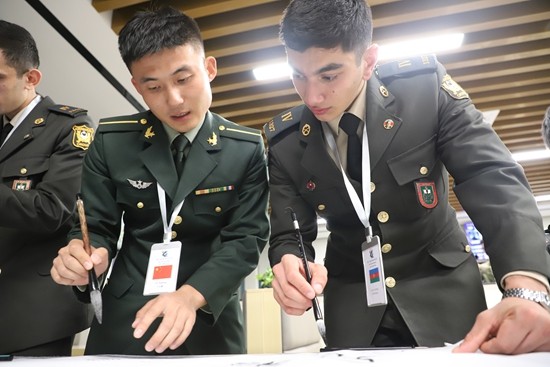 在国际学员周活动中,各国学员在近距离了解中华文化的同时,更深切感受到中国军人的热情友好、平易可亲。中国传统文化体验活动中,在书法体验区,韩艺玮手把手教泰国学员卡努特书写“兄弟”“朋友”等汉字。最后,卡努特独立写下了“我们是兄弟”五个大字。他告诉韩艺玮,他要将这幅作品带回泰国,送给下一次参加国际学员周的泰国学员,将这份特殊的友谊永远延续下去。