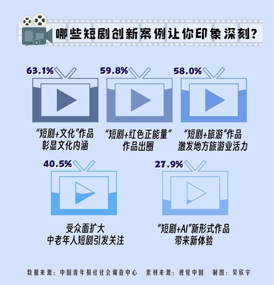 近些年,随着短剧的蓬勃发展,许多创新的短剧形式涌现出来,如“短剧+文旅”跨界融合、“短剧+正能量”拓展题材、“短剧+AI”带来新体验。上周,中国青年报社社会调查中心联合问卷网(wenjuan.com),对1334名受访者进行的一项调查显示,63.1%的受访者觉得“短剧+文化”作品彰显文化内涵,让人印象深刻,55.9%的受访者认为当前短剧题材多样,可以满足不同群体需求。